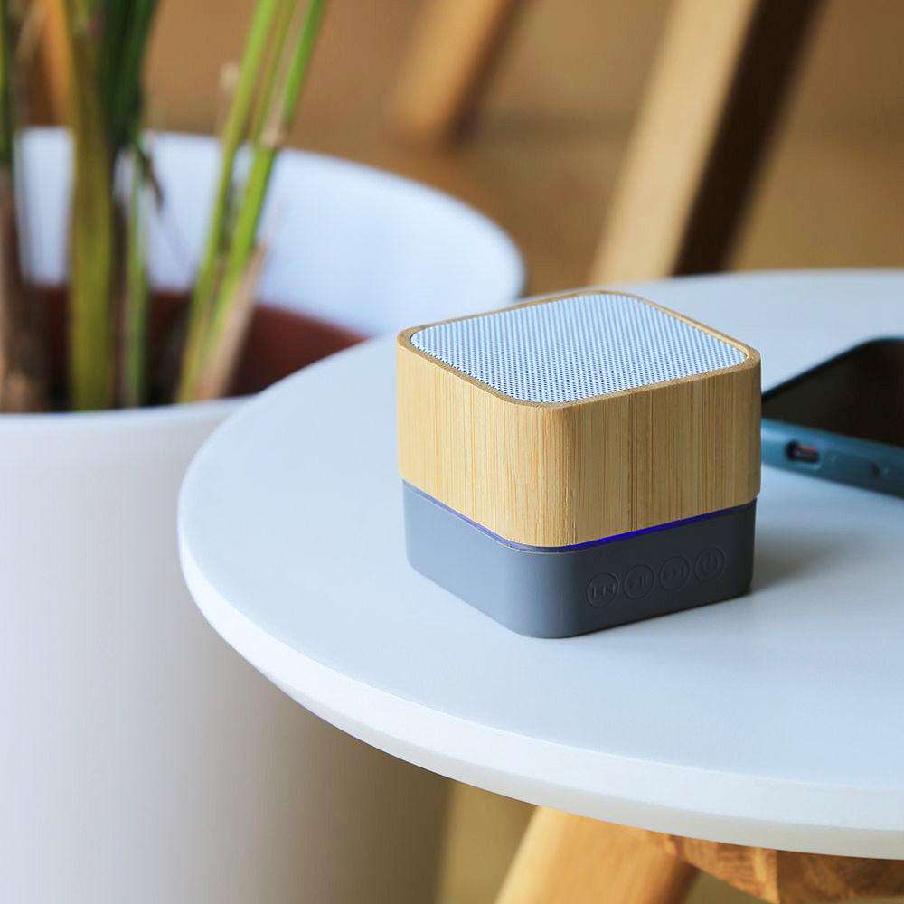 Stylish BT 5.0 bamboo speaker with LED accent, 3W output, SD card playback, and rechargeable battery.